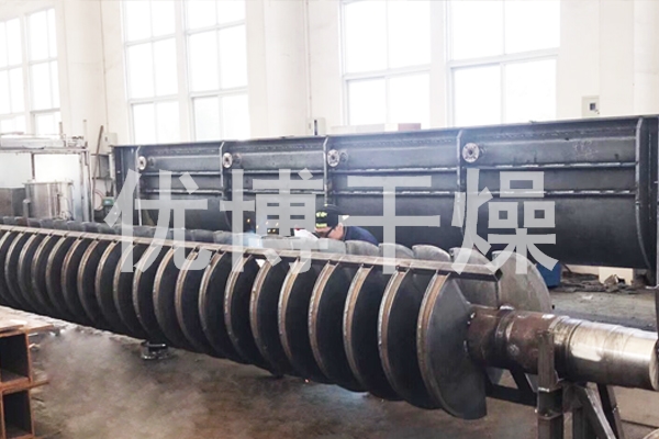 空心軸上密集排列著楔型中空漿葉,熱介質(zhì)經(jīng)空心軸流經(jīng)漿葉。單位有效容積內(nèi)傳熱面積很大,熱介質(zhì)溫度從-40℃到320℃,可以是水蒸汽,也可以是液體型:如熱水、導熱油等。間接傳導加熱,沒有攜帶空氣帶走熱量,熱量均用來加熱物料。熱量損失僅為通過器體保溫層向環(huán)境的散熱。楔型漿葉傳熱面具有自清潔功能。物料顆粒與楔型面的相對運動產(chǎn)生洗刷作用,能夠洗刷掉楔型面上附著物料,使運轉(zhuǎn)中一直保持著清潔的傳熱面。漿葉干燥機的殼體為Ω型,殼體內(nèi)一般安排二到四根空心攪拌軸。殼體有密封端蓋與上蓋,防止物料粉塵外泄而充分發(fā)揮作用。